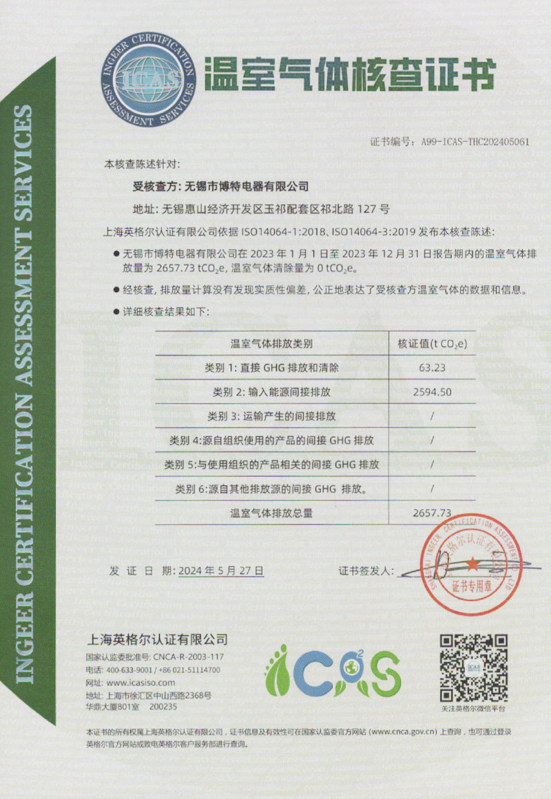 無錫市博特電器有限公司溫室氣體核查證書